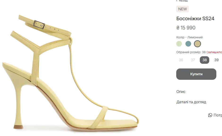 Фешенебельний образ красуня доповнила босоніжками з тонкими смужками лимонного кольору від українського бренду Каті Сільченко the Coat, На сайті бренду таке взуття коштує 16 тисяч гривень.
