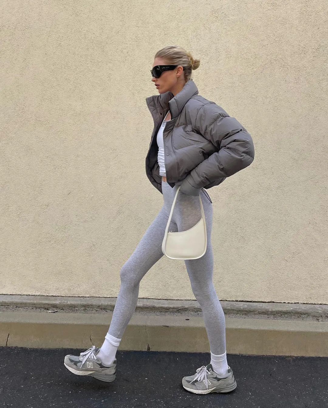 Під час нещодавньої прогулянки білявка стилізувала речі, які може повторити будь-яка модниця. Знаменитість одягнула тонкий пуховик сірого кольору, який поєднала зі світло-сірими лосинами. Під низ Ельза одягнула сірий топ з білою майкою.