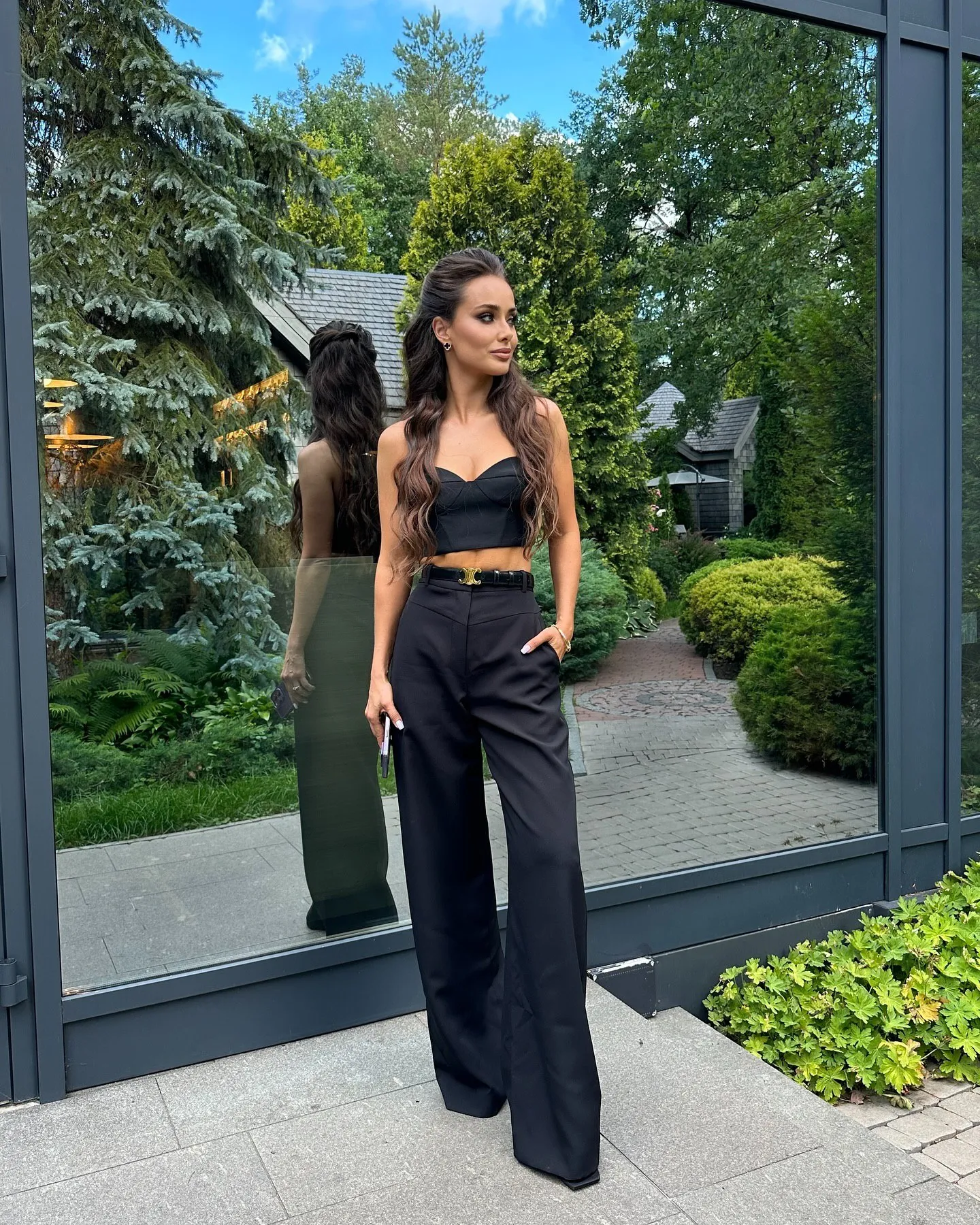 На своє 35-річчя знаменитість вирішила обрати вбрання від української дизайнерки Олени Реви. Акторка обрала чорний корсетний топ за 14 тисяч гривень та штани палаццо також від бренду Elenareva. Образ доповнив шкіряний пояс від Celine.