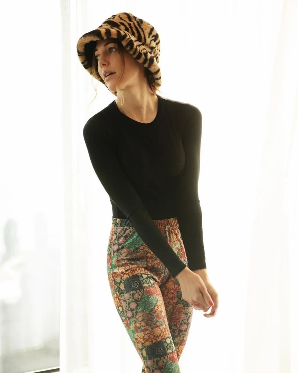 Знаменитість позувала перед турецьким фотографом Фетхі Карадуманом. 38-річна акторка одягнула для нової фотосесії класичний чорний світшот та шовкові лосини в квіти. Зірка зачесала волосся в пучок, випустивши передні пасма. Зверху вона одягнула стильний головний убір, який ідеально доповнить зимові аутфіти.