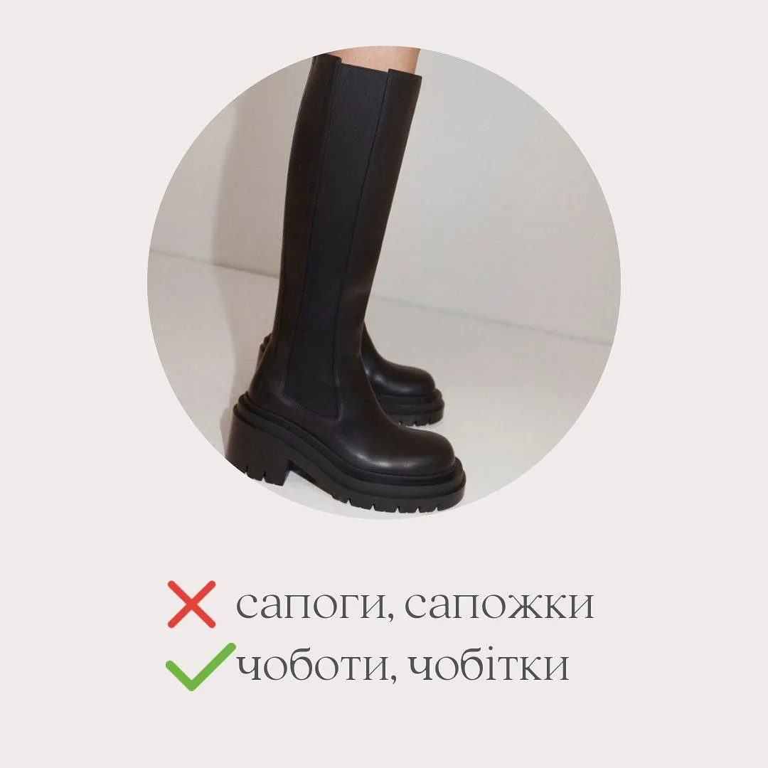 - Сапоги, сапожки – чоботи, чобітки;