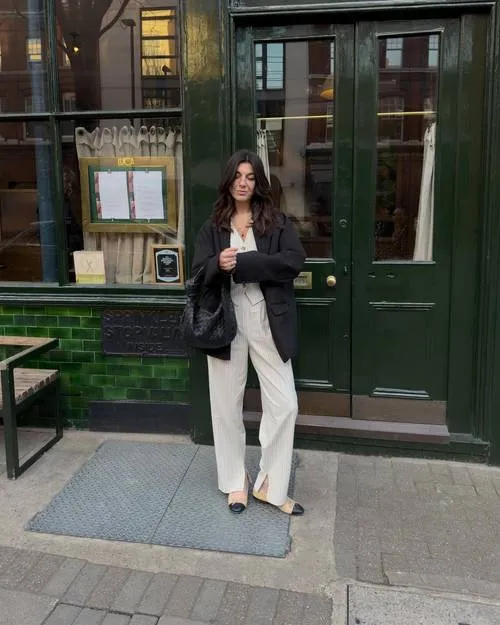 Поєднуйте витончені балетки з елегантним кроєм речей. Стилізуйте чорний блейзер з кремовими штанами та жилеткою, доповнюючи look чорною сумкою.