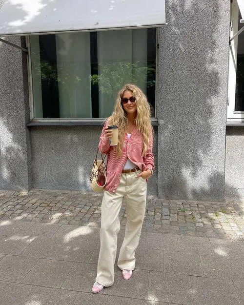 Беріть приклад з Емілі Сіндлев та одягайте яскравий кардиган разом зі світлими штанами. Рожевий колір інфлюенсерка обрала не випадково. Вона доповнила кардиганом тон ніжно-рожевих балеток.