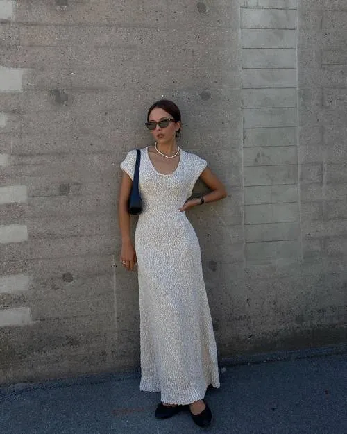 Текстурована сукня довжини максі гарно поєднається з мінімалістичними балетками. Щоб додати трохи романтичності, доповніть образ прикрасою з перлинок.