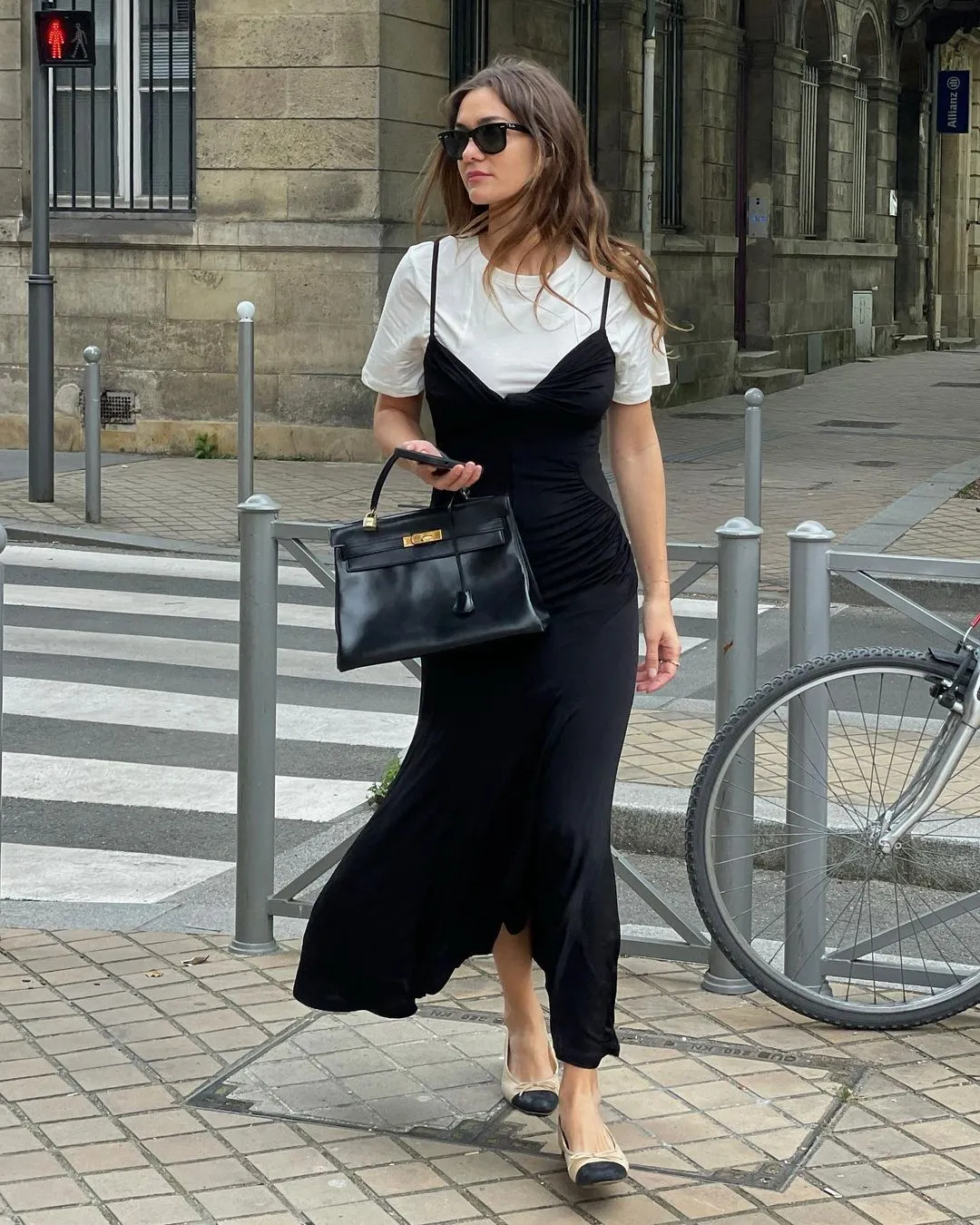 Сукні-комбінації дуже універсальні, тож їх неможливо оминути увагою. Надихнувшись образом фешіоністи, радимо під низ одягнути футболку для створення невимушеного французького шику. Саме до такого образу ідеально підходять туфлі.