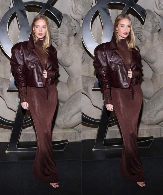 Так, на показ осінньо-зимової колекції Saint Laurent, який пройшов у Парижі, Розі Гантінгтон-Вайтлі прийшла у коричневій сукні довжини максі з напівпрозорого матеріалу. З-під сукні виднілася білизна та вражаюче декольте білявки, яке вона прикрила об’ємною шкіряною курткою.