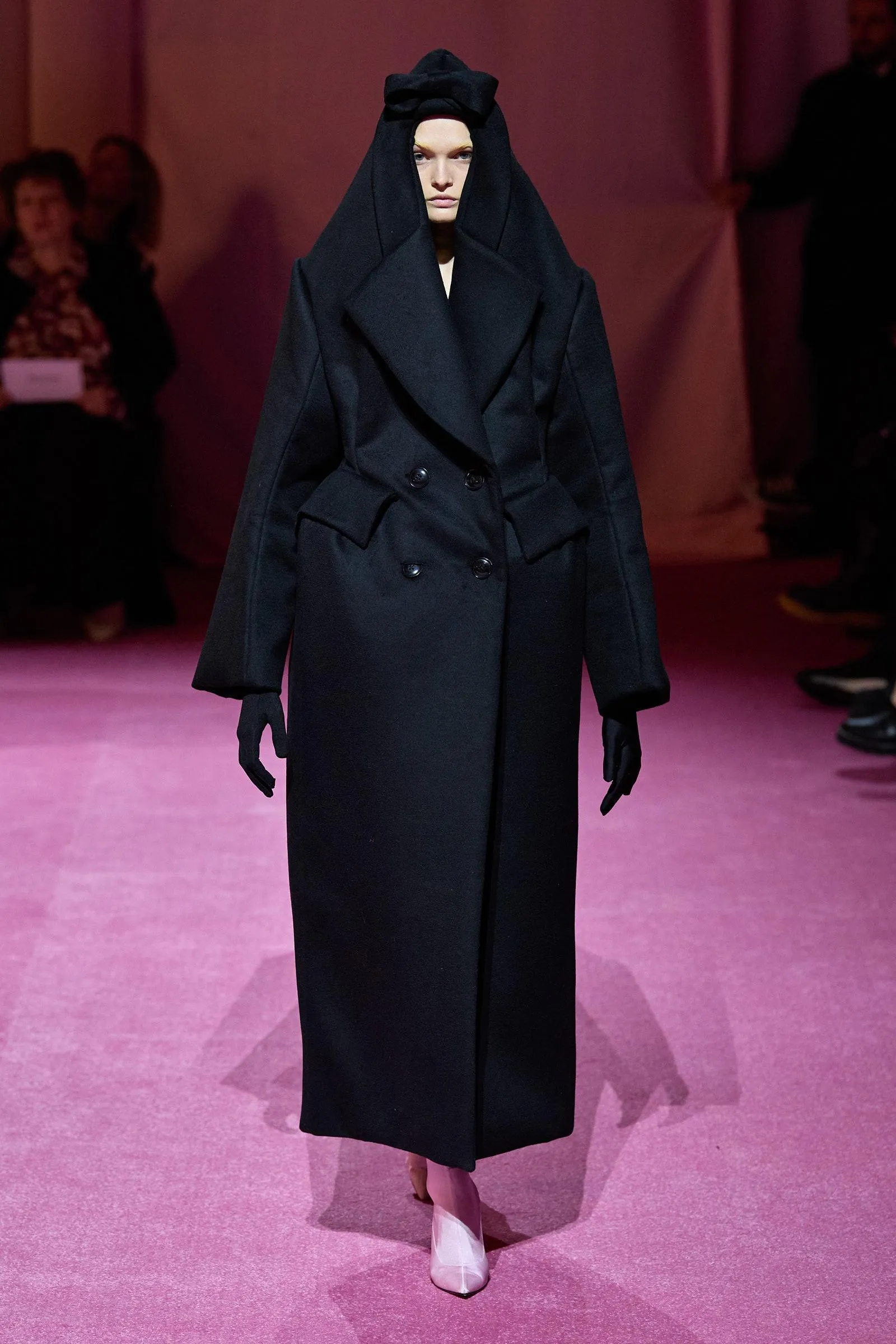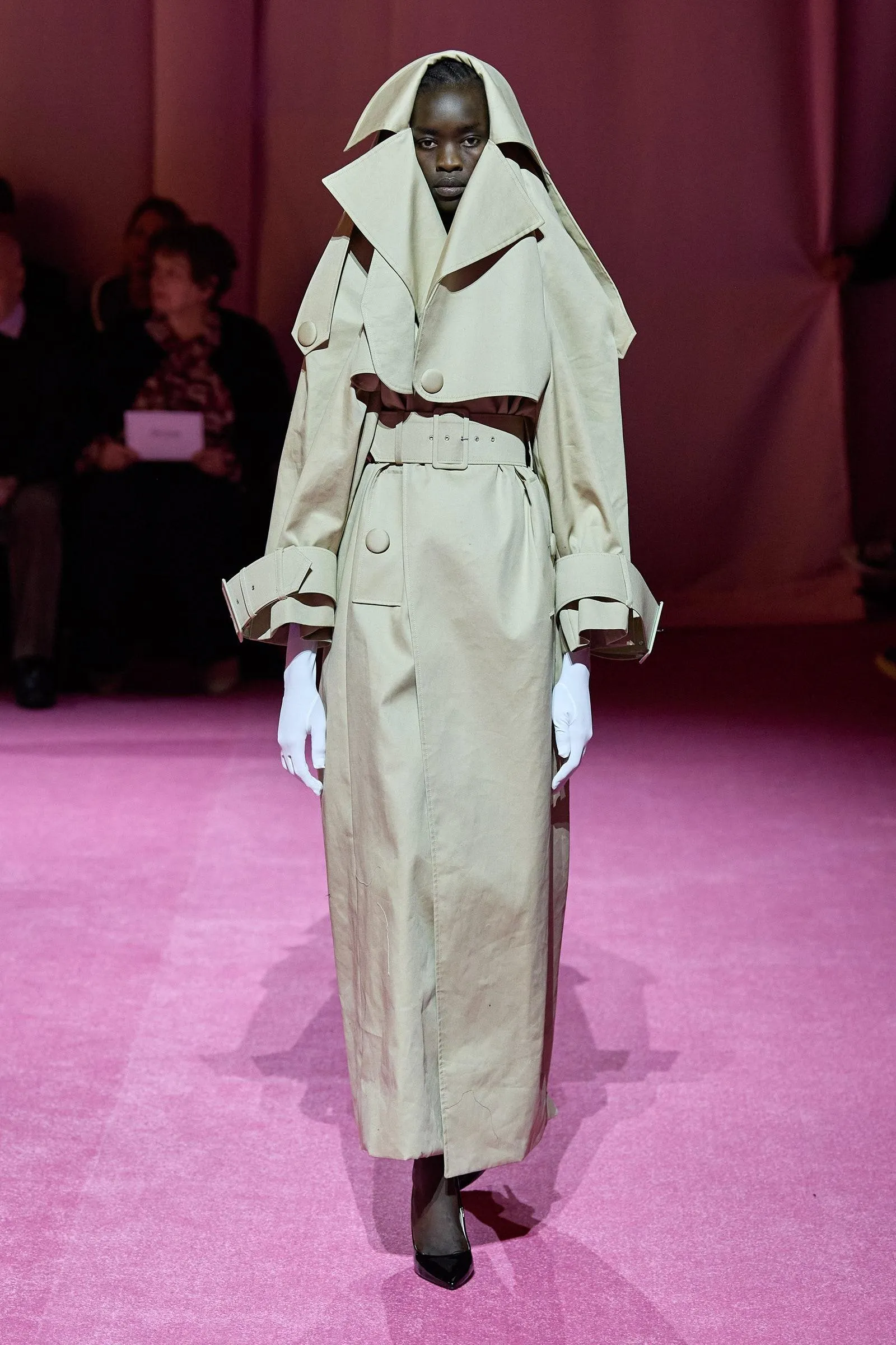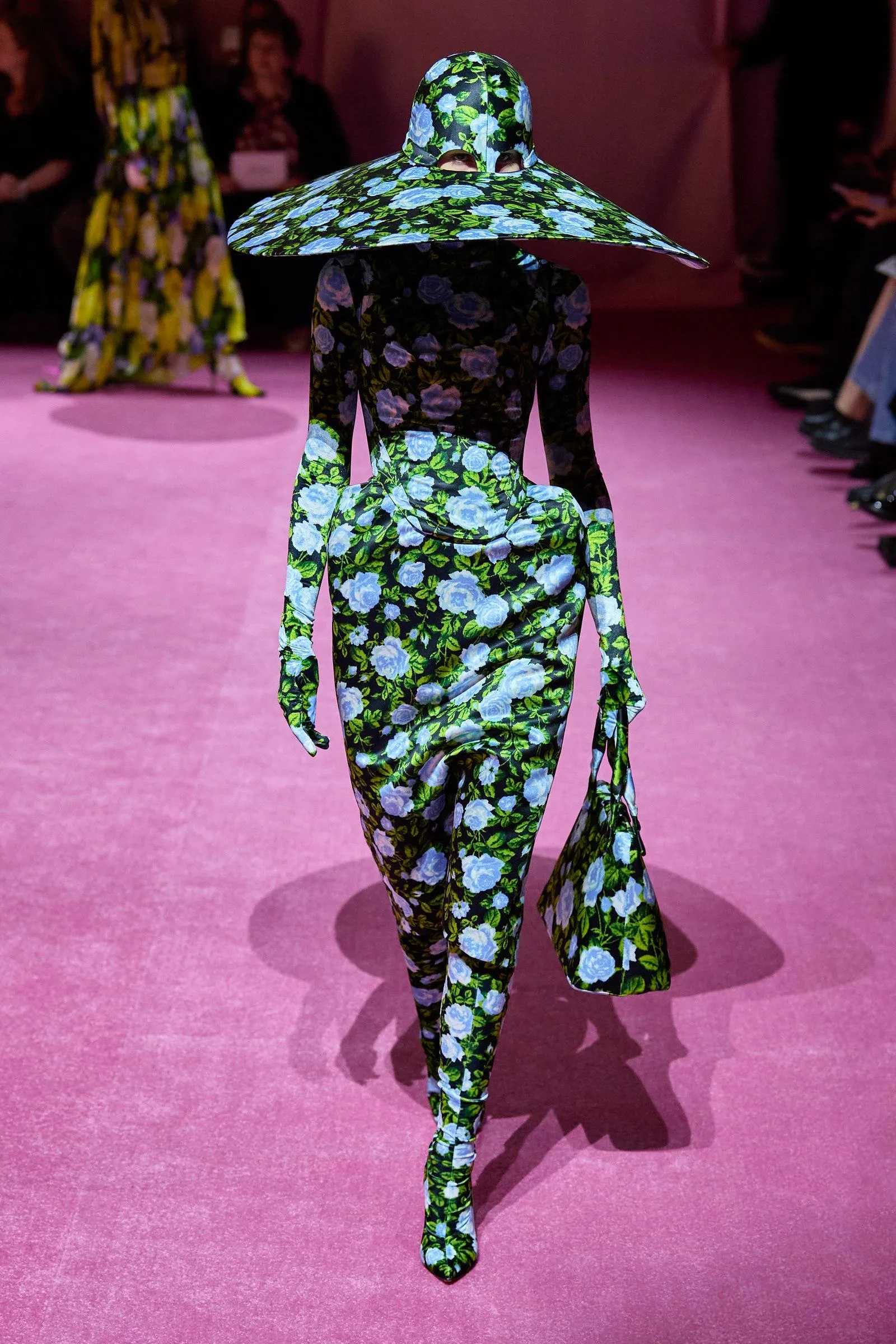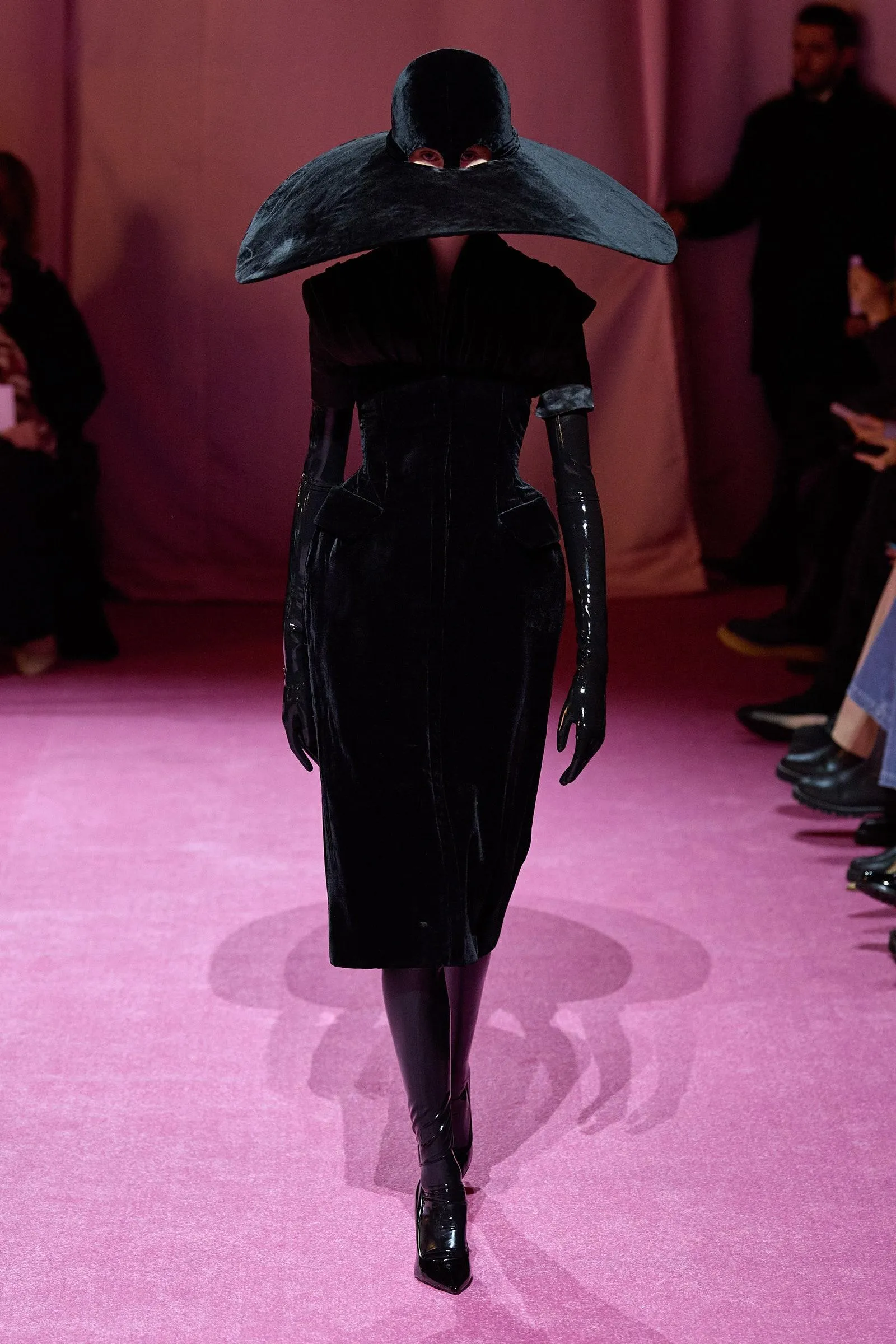 Дизайнер также представил цветочные аутфиты с габаритными шляпами, кэтсьюты, бархатные приталенные платья, тренчи, латексные комбинезоны и головные уборы с прорезями для глаз.