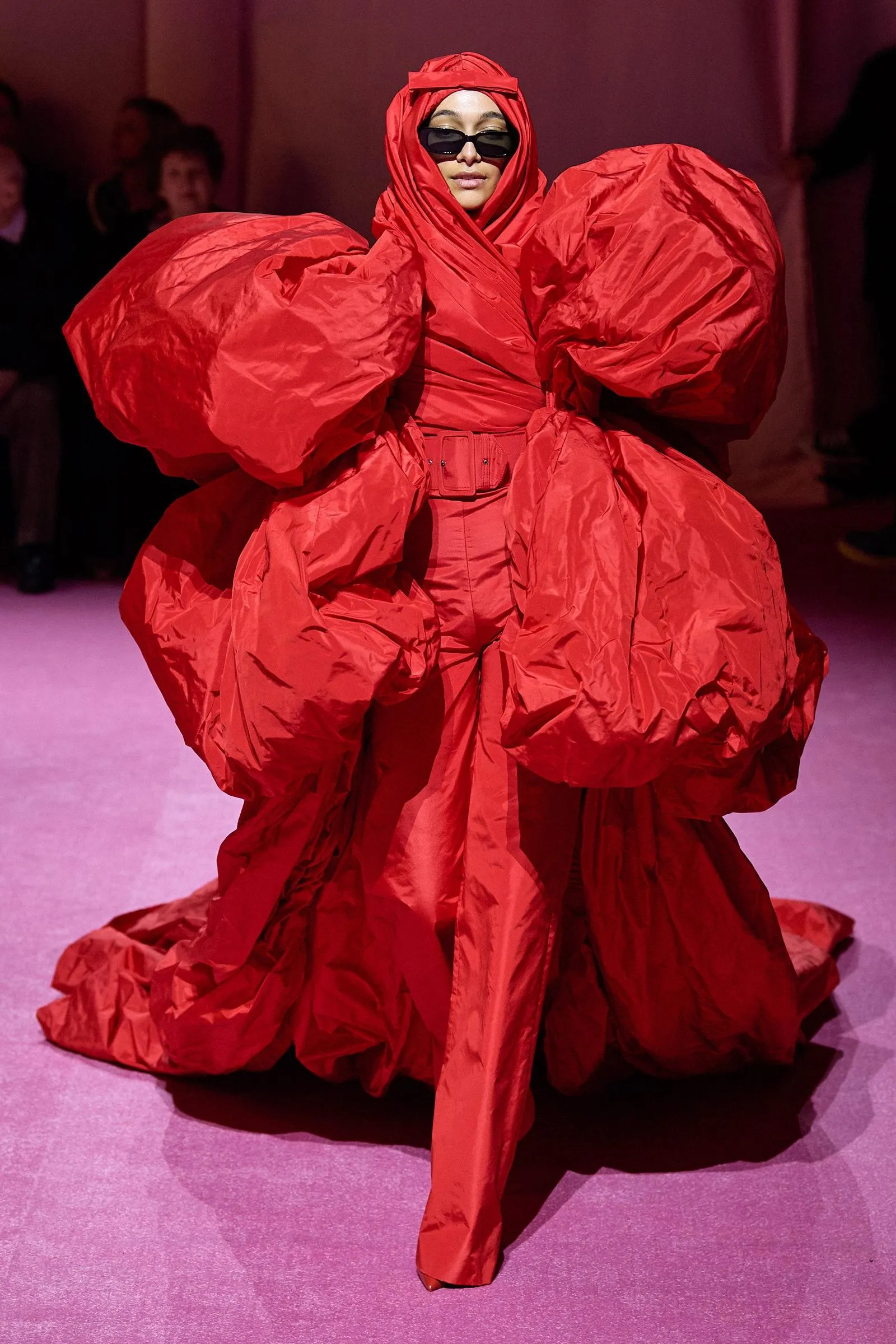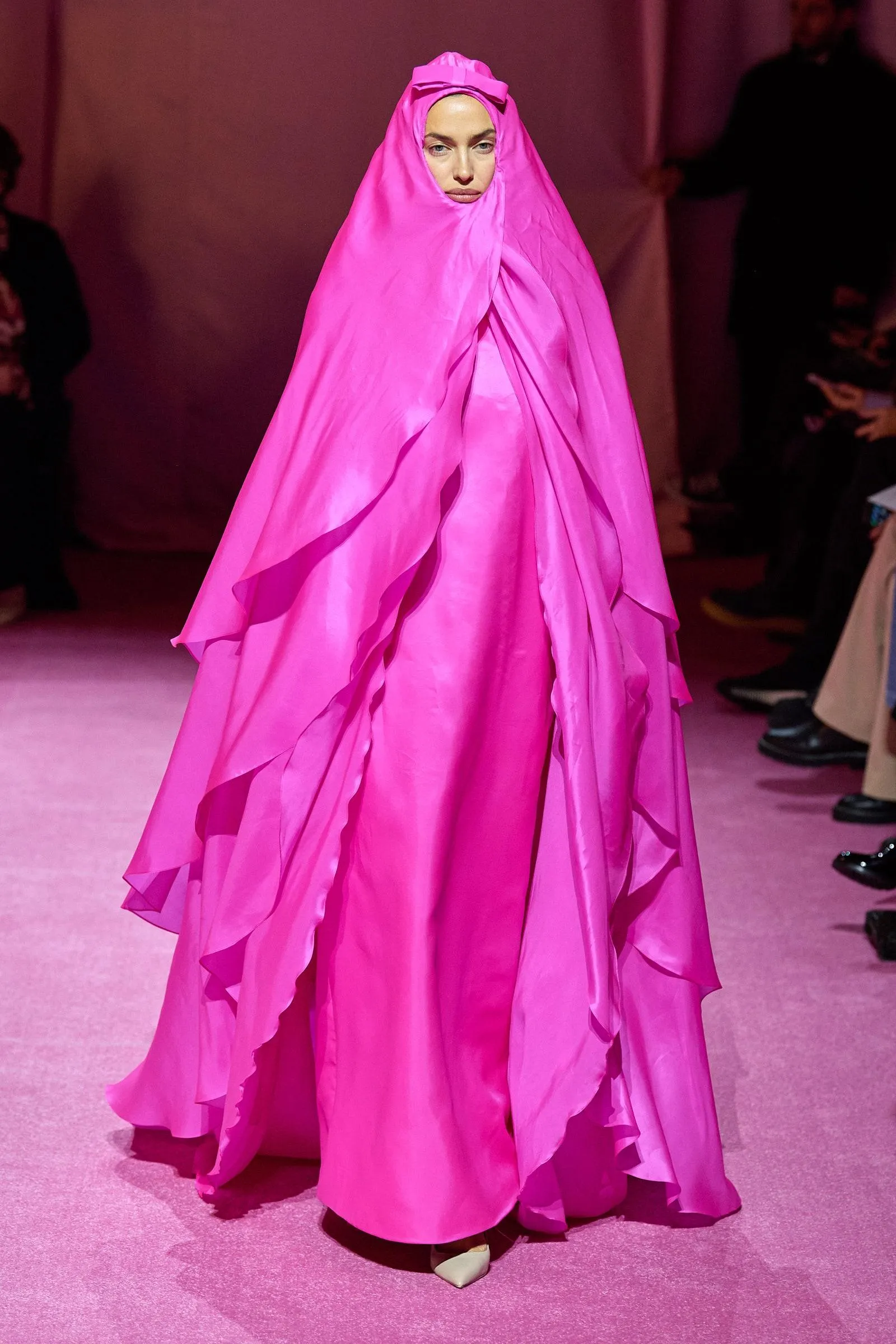 Кульминацией показа стал выход Ирины Шейк в розовом платье-коконе. Изделие полностью закрыло ее тело и голову. Дизайнер оставил открытой только часть лица. Минималистическое платье 36-летней манекенщицы вызвало восторг у публики, поэтому зал аплодировал стоя.