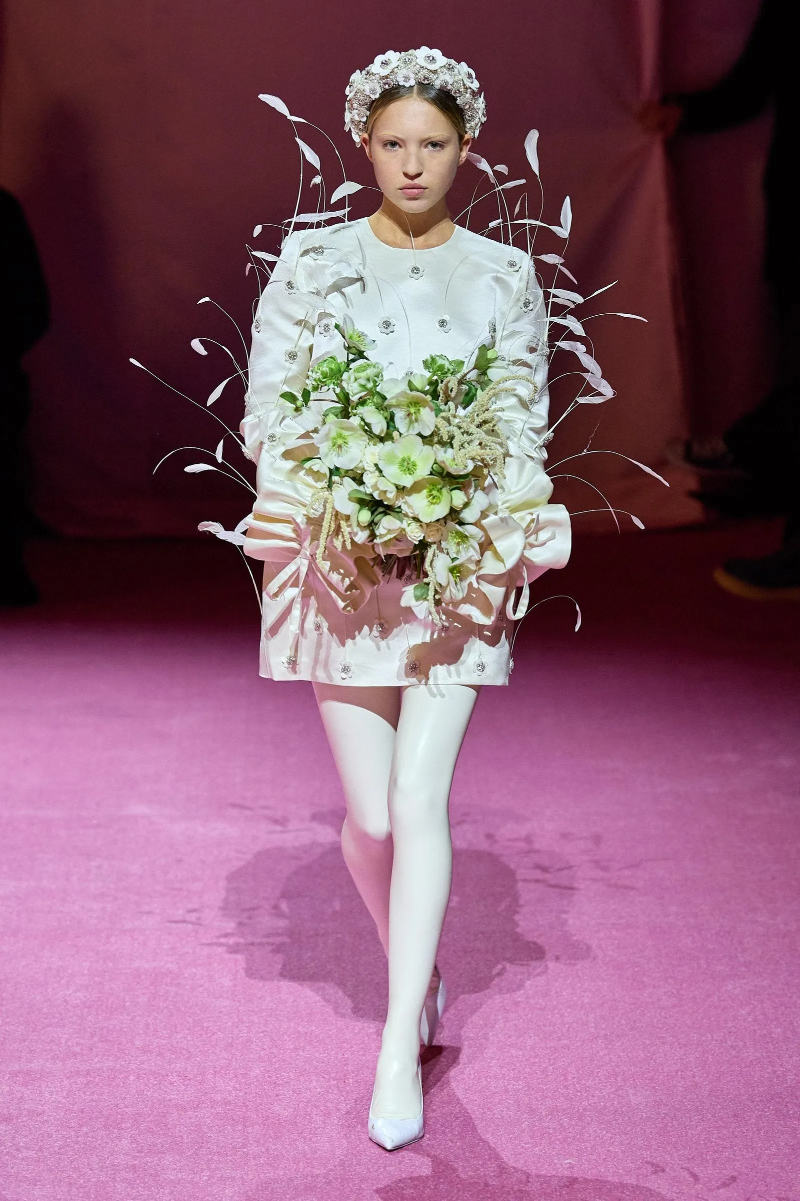 В рамках Недели моды в Лондоне Ричард Квинн представил новую коллекцию. Дизайнер пригласил на шоу дочь супермодели Кейт Мосс, 19-летнюю Лилу. Девушка вышла на подиум в белом платье с букетом цветов в руках. Ее образ дополняли белые колготки, туфли и объемный ободок из цветов на голове.