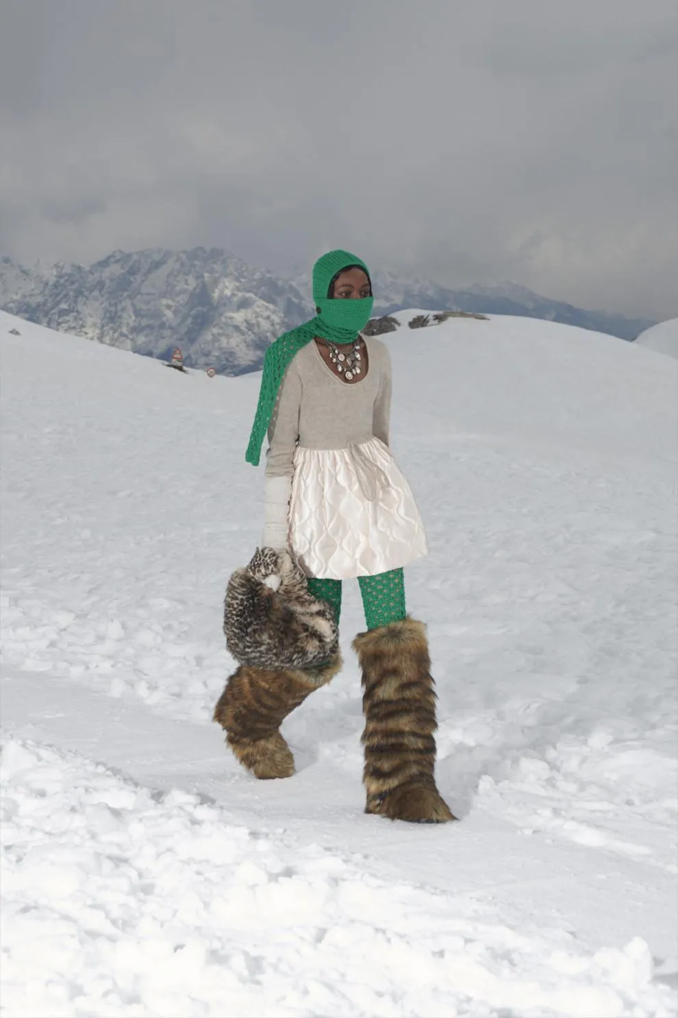 К еще одному необычному показу прибегла дизайнер Миучча Прада. Модели представили наряды Miu Miu в окружении зимних гор. Модели прошлись по заснеженным Альпам в балаклавах, комбинезонах, стеганых куртках и меховых монбутах.