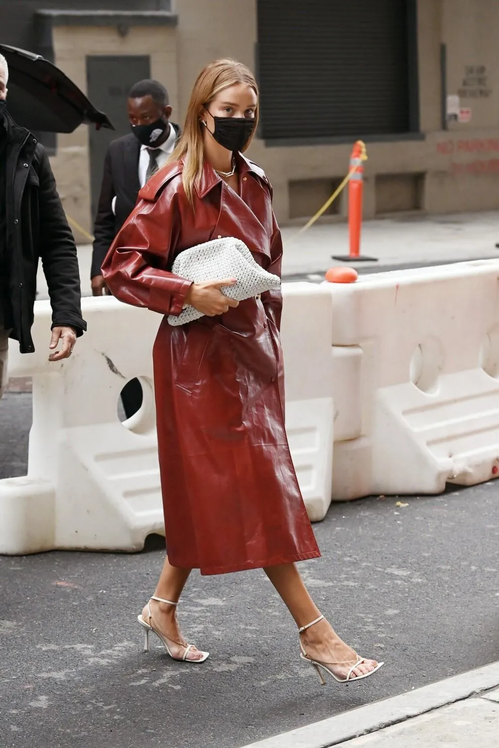 Британская модница Рози Хантингтон-Уайтли, как всегда, демонстрировала своим поклонникам интересные и лаконичные аутфиты. Папарацци весной подловили модель в роскошном красном кожаном тренче, а летом блондинка показала трендовый look.
