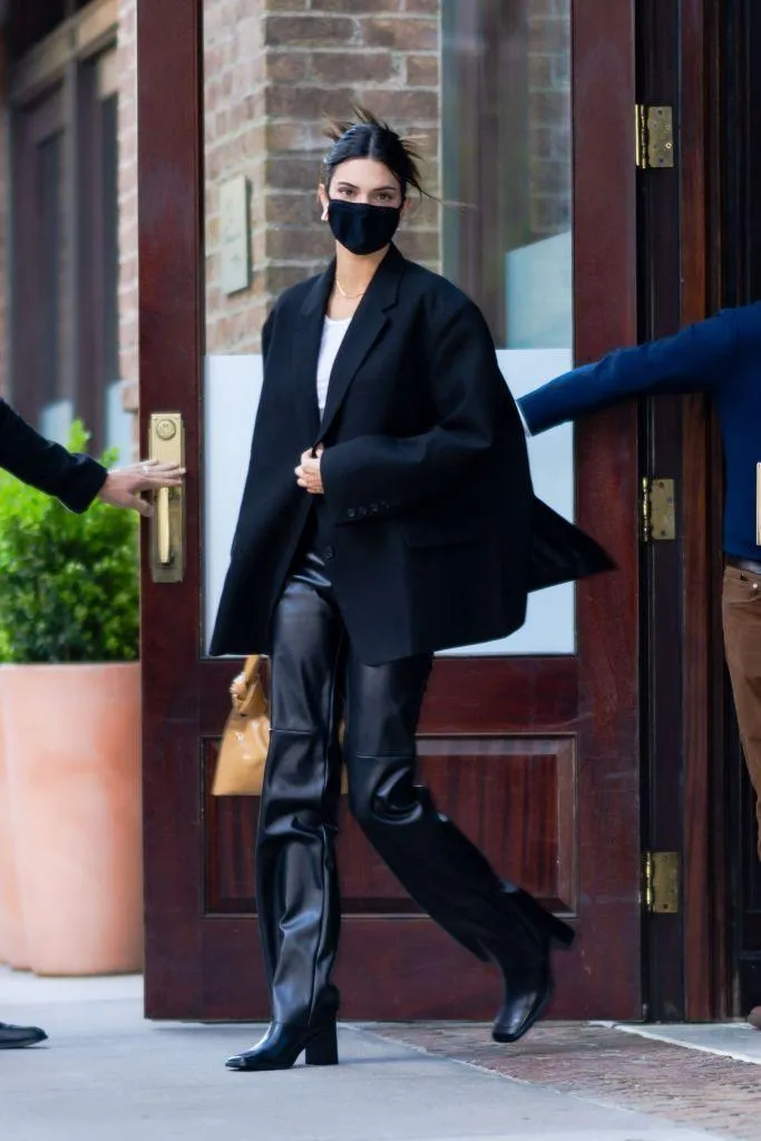 В 2021 году на модную арену вышли кожаные брюки широкого кроя, которые можно легко совместить с любой одеждой. Модель Кендалл Дженнер выбрала черный жакет оверсайз и закрепила волосы трендовым украшением из нулевых – крабиком.