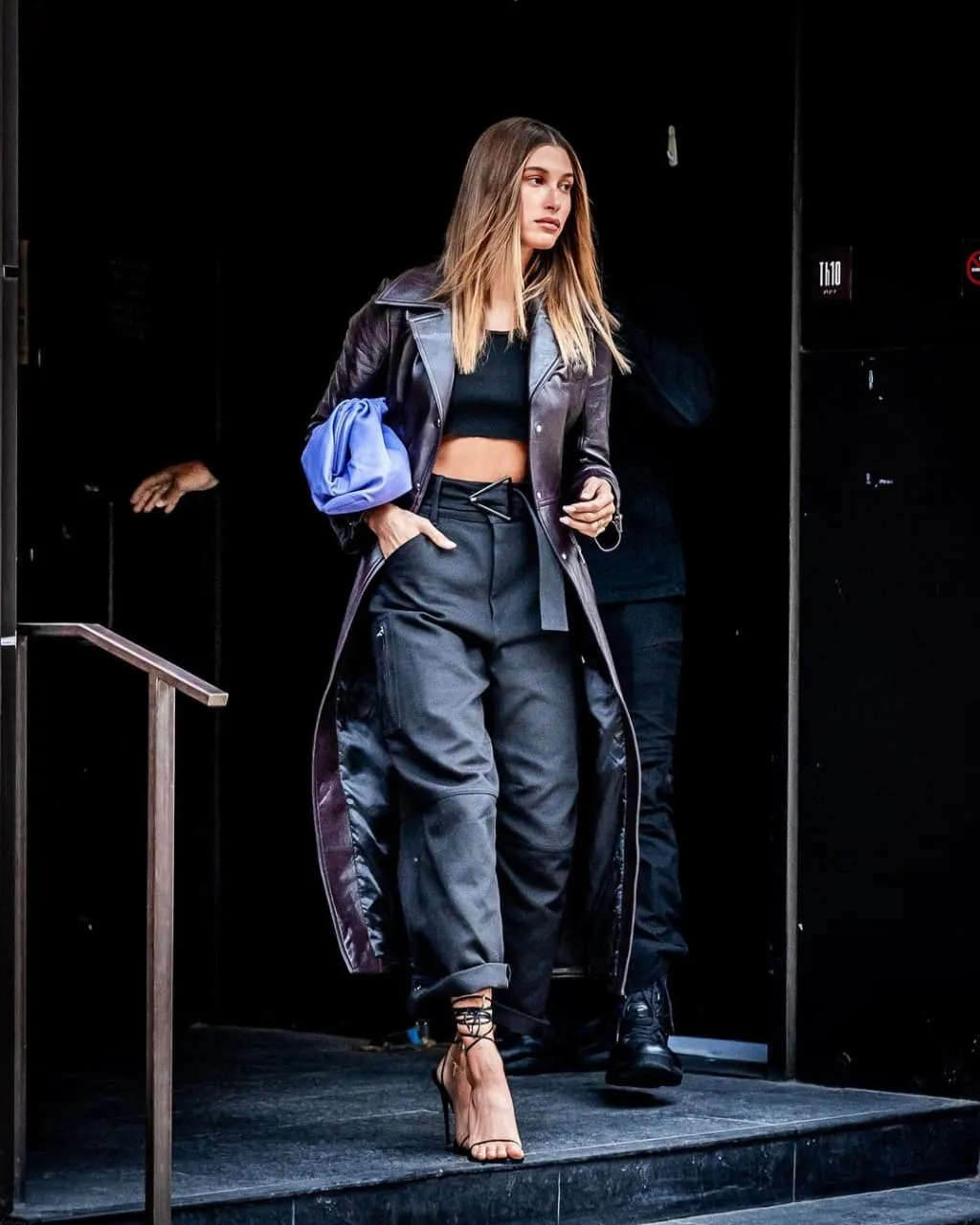 Модная икона Хейли Бибер в течение года почти не расставалась с кожаными изделиями. На своем примере знаменитость показала, как можно эффектно разбавить темный образ благодаря яркой сумке. Во время двух выходов в кожаном тренче и жакете, Хейли довершала аутфиты сиреневым и зеленым клатчем.