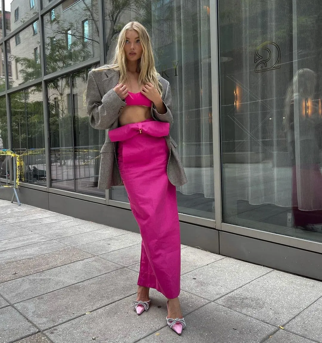 Эльза дополнила объемным серым блейзером розовый костюм и туфли с бантиками, а также соединила с ним белые брюки. Именно в этих образах манекенщица появлялась во время Недели моды в Нью-Йорке осенью.