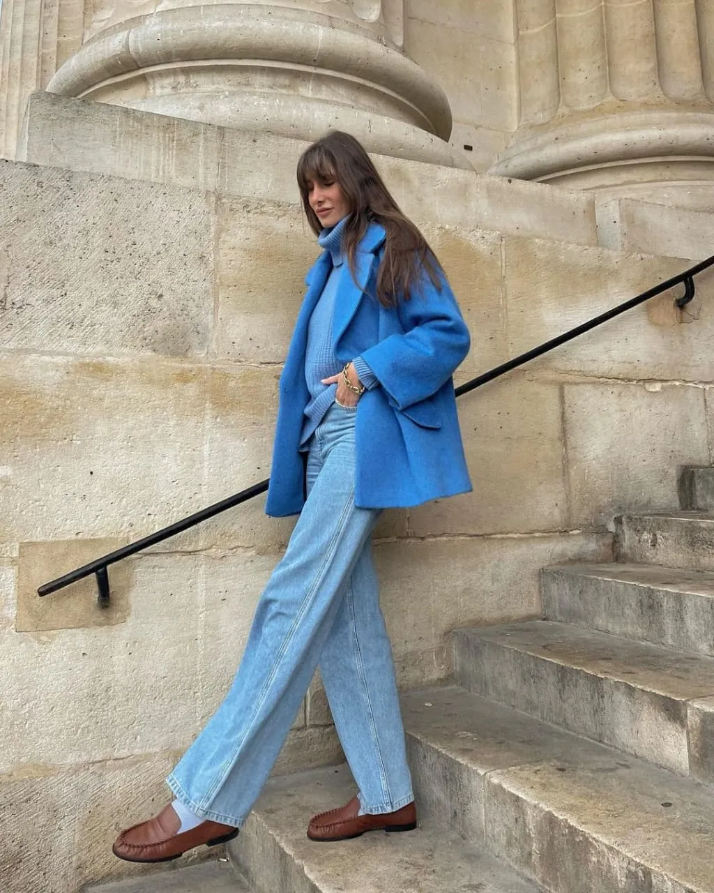 Надавно модница с Корсики продемонстрировала очаровательный look в голубом цвете. По восточному календарю 2022 год продлится под эгидой Голубого Водяного Тигра, поэтому чтобы задобрить хозяина года, Жюли примерила голубой вязаный свитер с шерстяным коротким пальто и голубыми джинсами.
