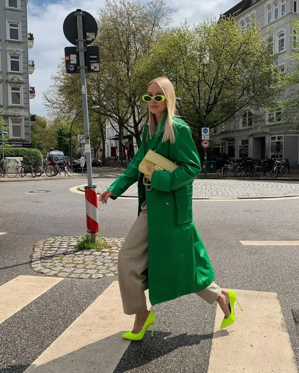 Также знаменитость показывала на своем примере сочетание зеленого тренча с лимонной сумкой и неоновыми туфлями.