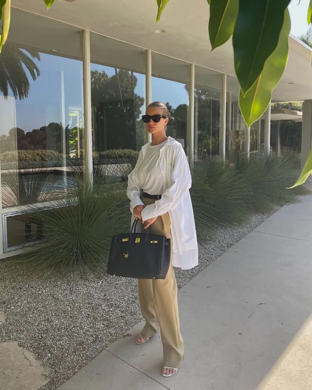 Рози надела базовую белую футболку и рубашку, которую соединила с бежевыми штанами. Такое трио пользовалось особой популярностью у модниц со всего мира.