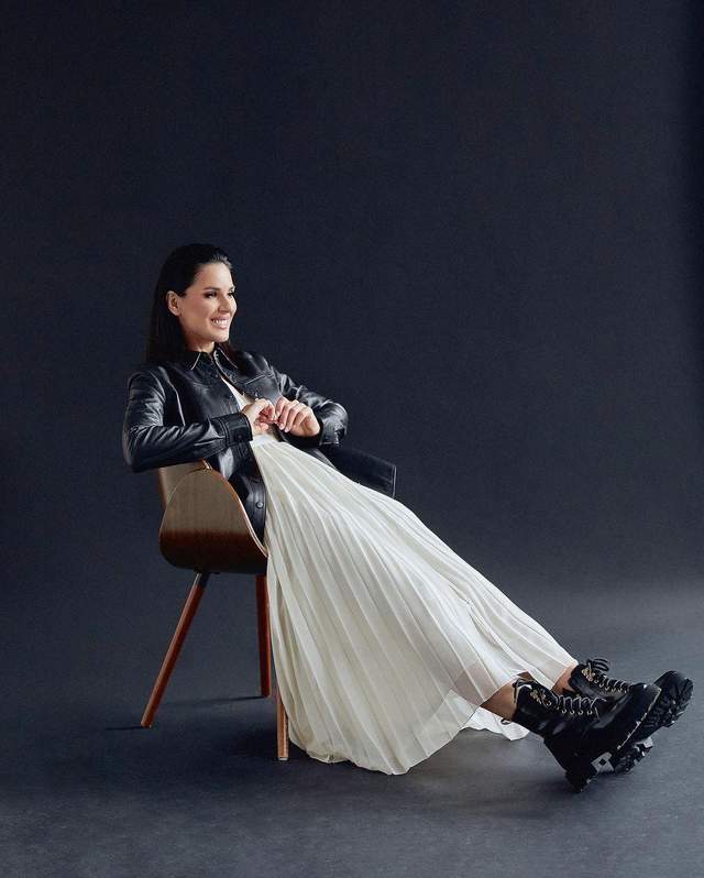 - черной кожаной рубашкой и молочным платьем с плиссированной юбкой;