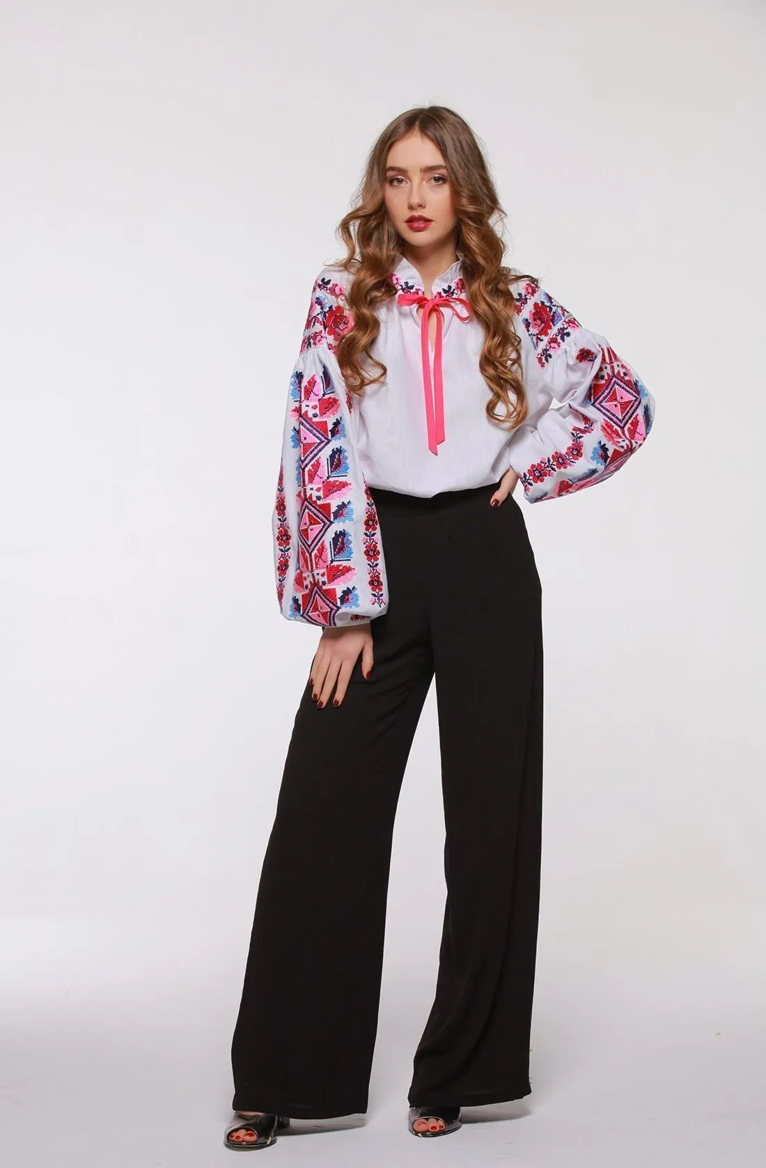 Вишиванка зі штанами палаццо – просто комбо неперевершеного образу. Доповнюйте такий look білосніжними кросівками або босоніжками на підборах. Окрім того, вишиванку ще можна поєднати зі шкіряними штанами, які виглядають ефектно та цікаво. Також не забувайте про аксесуар у вигляді сумки та ніжні прикраси – сережки, ланцюжки та браслети.