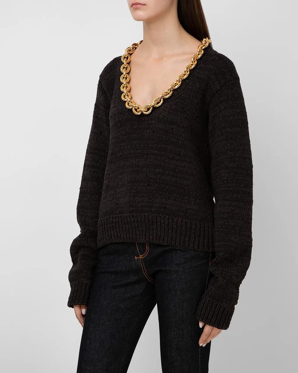 Вовняний джемпер з розслабленим силуетом та характерним золотистим ланцюжком привертає увагу своїм глибоким декольте. Він оздоблений ребристими краями на манжетах та подолі джемпера. Такий светр ідеально підійде для штанів з екошкіри, міні, максі, або плісированих спідниць. Особливої святковості додадуть чоботи на високому каблуці.