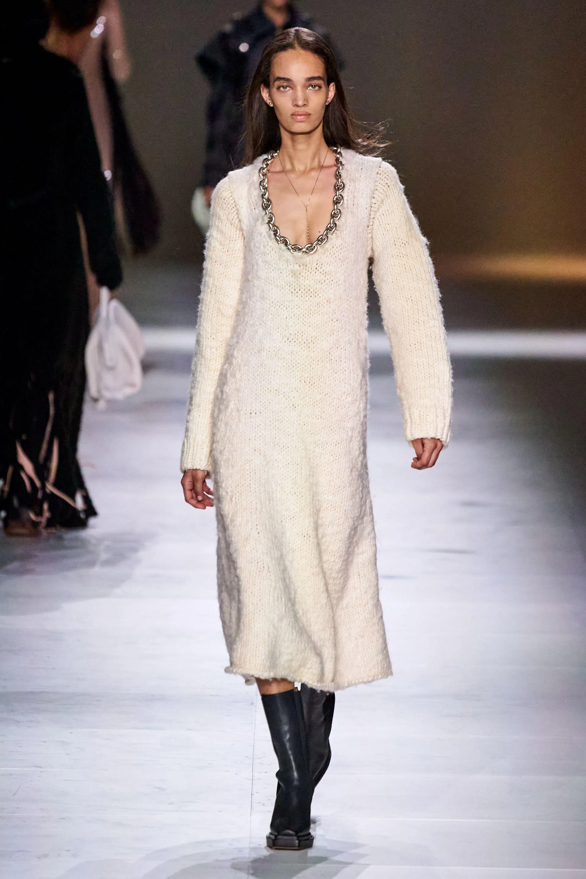 Дизайнери Bottega Veneta також показали шерстяну сукню міді білого кольору з ланцюжком, яку ви можете застосовувати у своєму гардеробі вже, або на початку весни. Звичайне трикотажне плаття, прикрашене ланцюгом, виглядає абсолютно інакше і задає інший настрій.