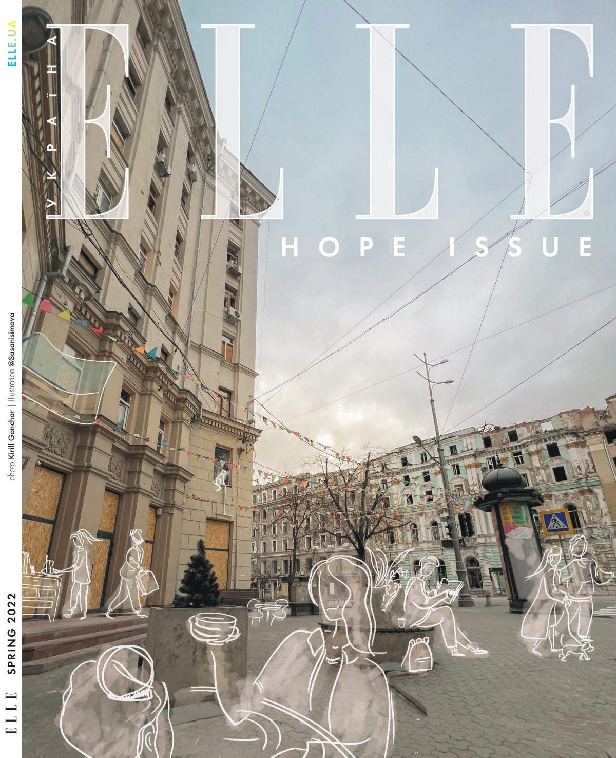 На обкладинці глянцю Elle – ілюстрація харків’янки Олександри Анісімової, яка зобразила на одній з вулиць Харкова – душі людей, тіла яких назавжди покинули цей світ, але ще продовжують жити в місті. Вони ходять в магазини, п’ють каву з друзями, читають книги та гуляють містом. Саме таким український Elle побачив автор обкладинки Кирило Гончар.