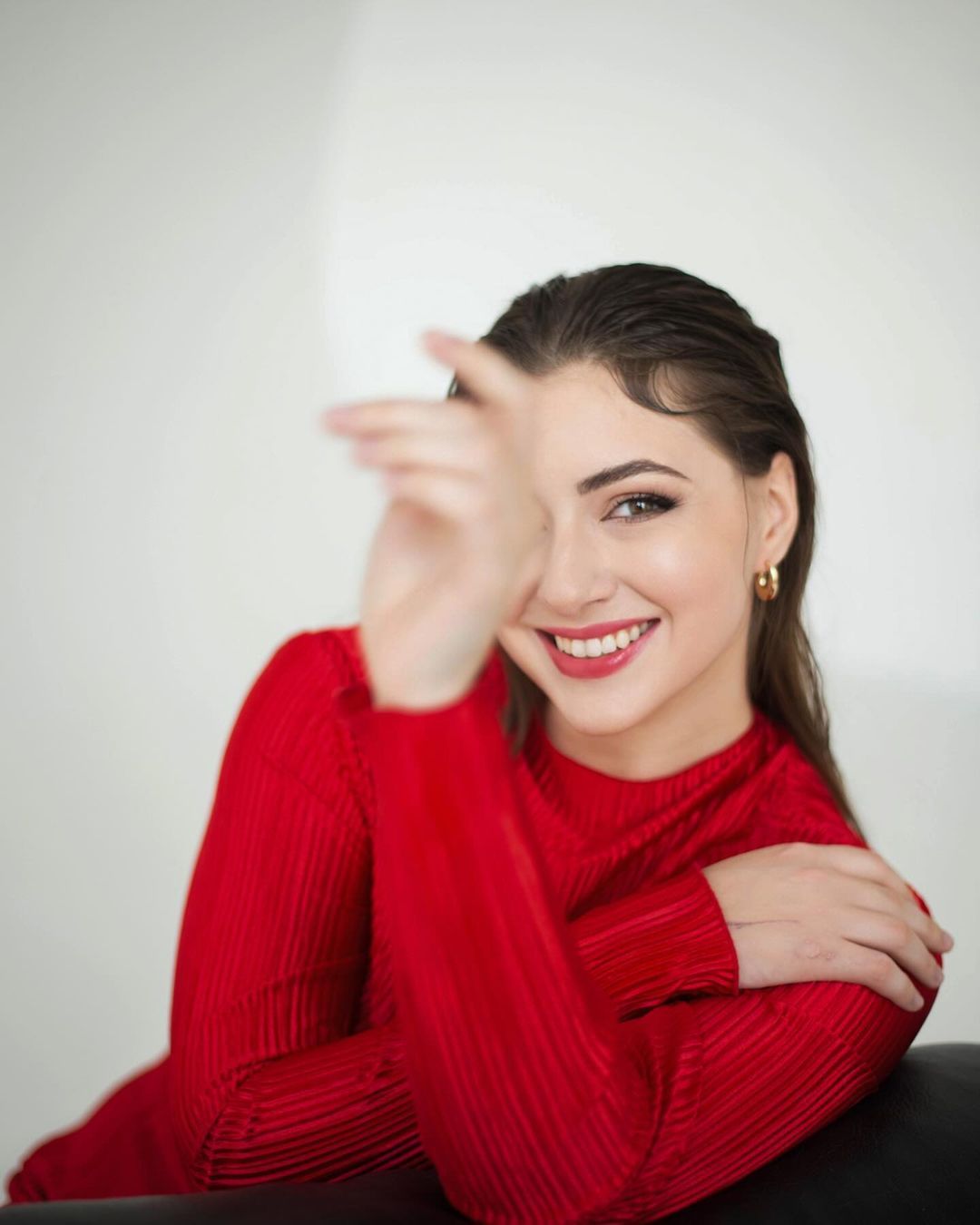 Акторка опублікувала в соцмережах серію фото, які зробила в білосніжній студії. Катерина постала перед камерою у довгій сукні плісе трендового червоного кольору. Таке вбрання вдало підкреслило фігуру акторки. Волосся Тишкевич вклала назад, а на обличчі зробила макіяж з коричневими тінями на повіках і малиновим блиском на губах. Довершила жіночний і спокусливий аутфіт вишуканими сережками.