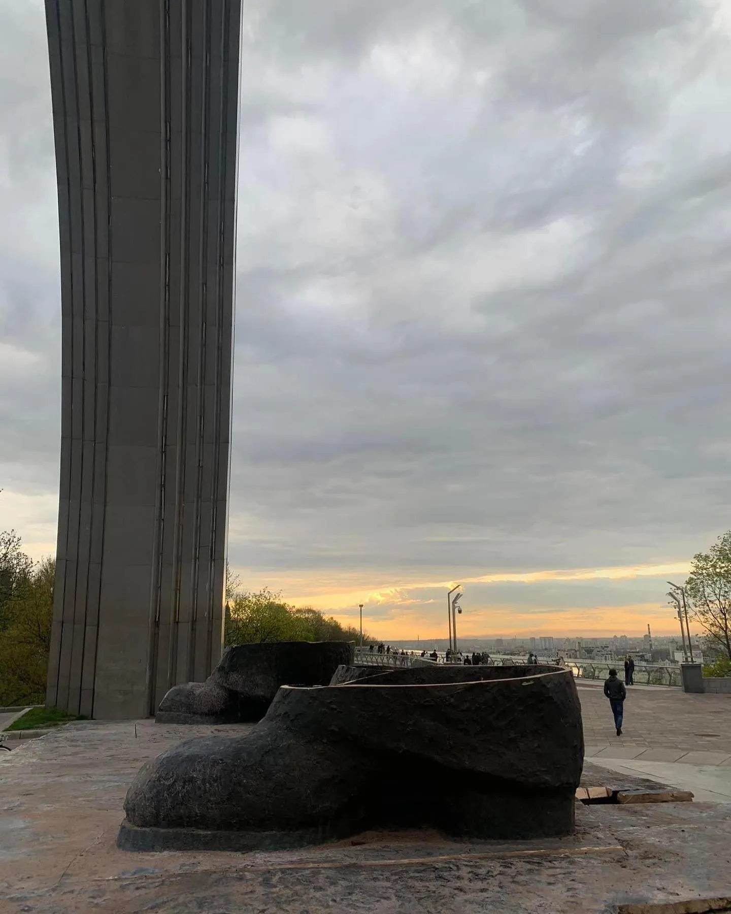 Фахівці спиляли основу скульптури, тож тепер від неї залишилося лише взуття. Фото вечірнього Києва з "залишком" від скульптури двох робітників показала у своєму інстаграмі дизайнерка Світлана Бевза.