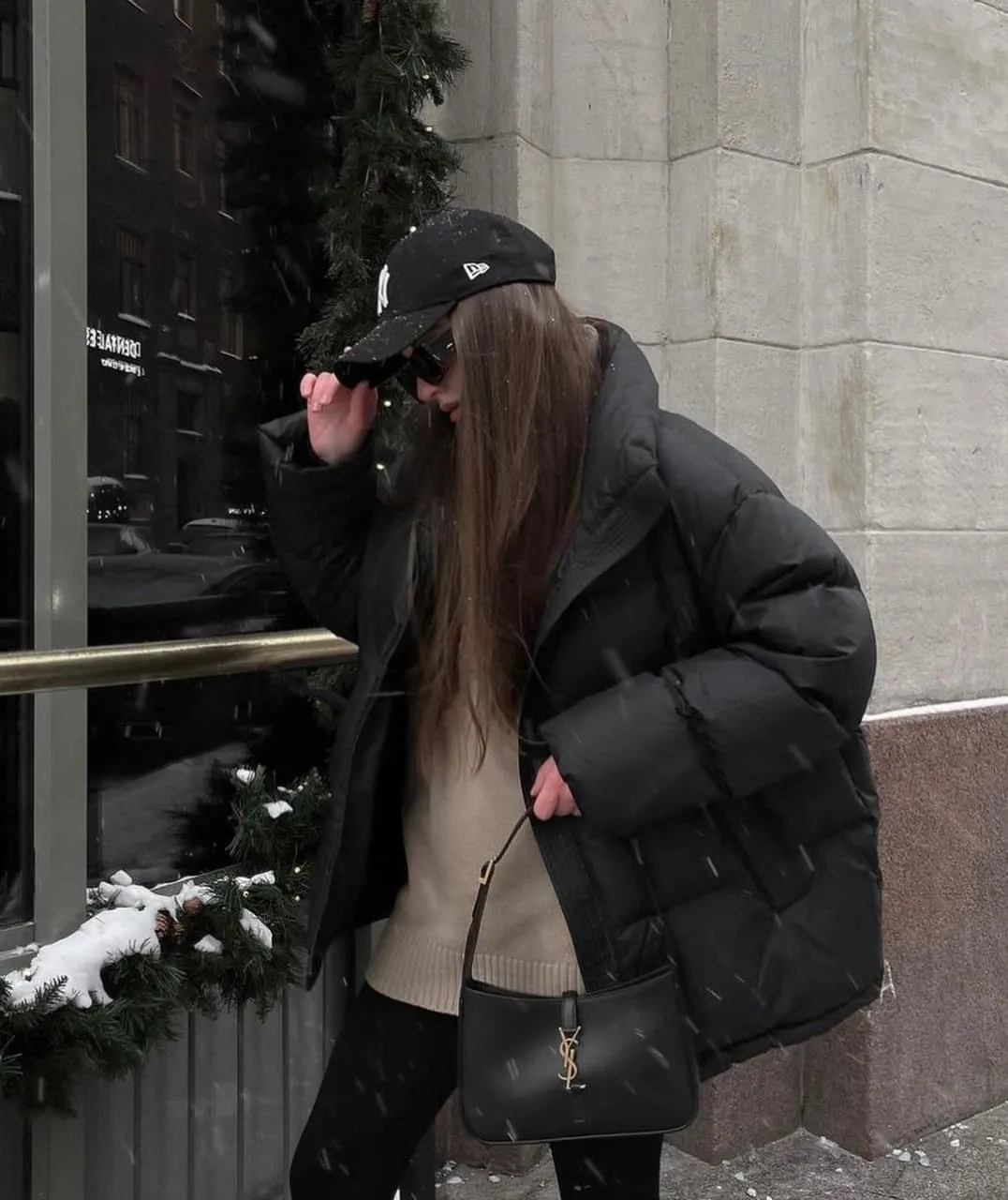 Чорний total look завжди буде в моді, тому взимку можете сміливо одягати пуховик з лосинами та довершувати образ бейсболкою з чорною сумкою. Щоб трохи розслабити look від строгості, одягайте бежевий светр з горловиною.
