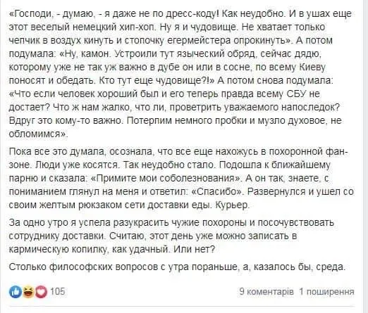 У дописі Пліхіна розповіла, як випадково опинилася серед похоронної процесії і зневажливо описала її: "Дядьку вже неважливо, в дубі він чи в сосні... провітрять шановного наостанок... поносять по всьому Києву і підуть обідати".
