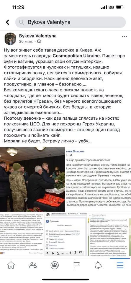 "Живе собі така дівчинка у Києві. Аж заступниця головного редактора Cosmopolitan Ukraine. Пише про х*ї й вагіни, прикрашаючи свої опуси матюками. Фотографується в панчішках і татушках, витончено відстовбурчуючи дупку, селфиться у примірювальних, збираючи лайки і сердечка. Насичено дівчинка живе, продуктивно, а головне – безпечно. Без комендантської години з ризиком потрапити на "підвал", де її місяць ґвалтуватиме взвод чеченців, без прильотів "Граду", без чорного всепоглинального жаху від смертей близьких, без безодні, в яку заглядаєш щодня", – написала Бикова.