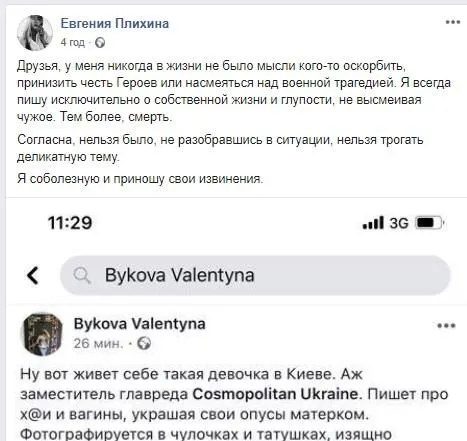 На скандал Євгенія Пліхіна також вирішила відповісти у фейсбуці. Редакторка глянцю вибачилася за свою публікацію.