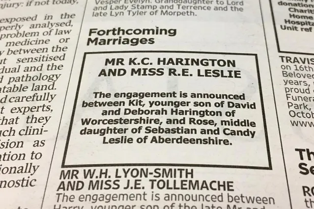 "Заручення оголошено між Кітом, молодшим сином Давіда і Дебори Харінгтон з Вустершира, і Роуз – середньою донькою Себастьяна і Кенді Леслі із Абердиншира", – йдеться в повідомленні.