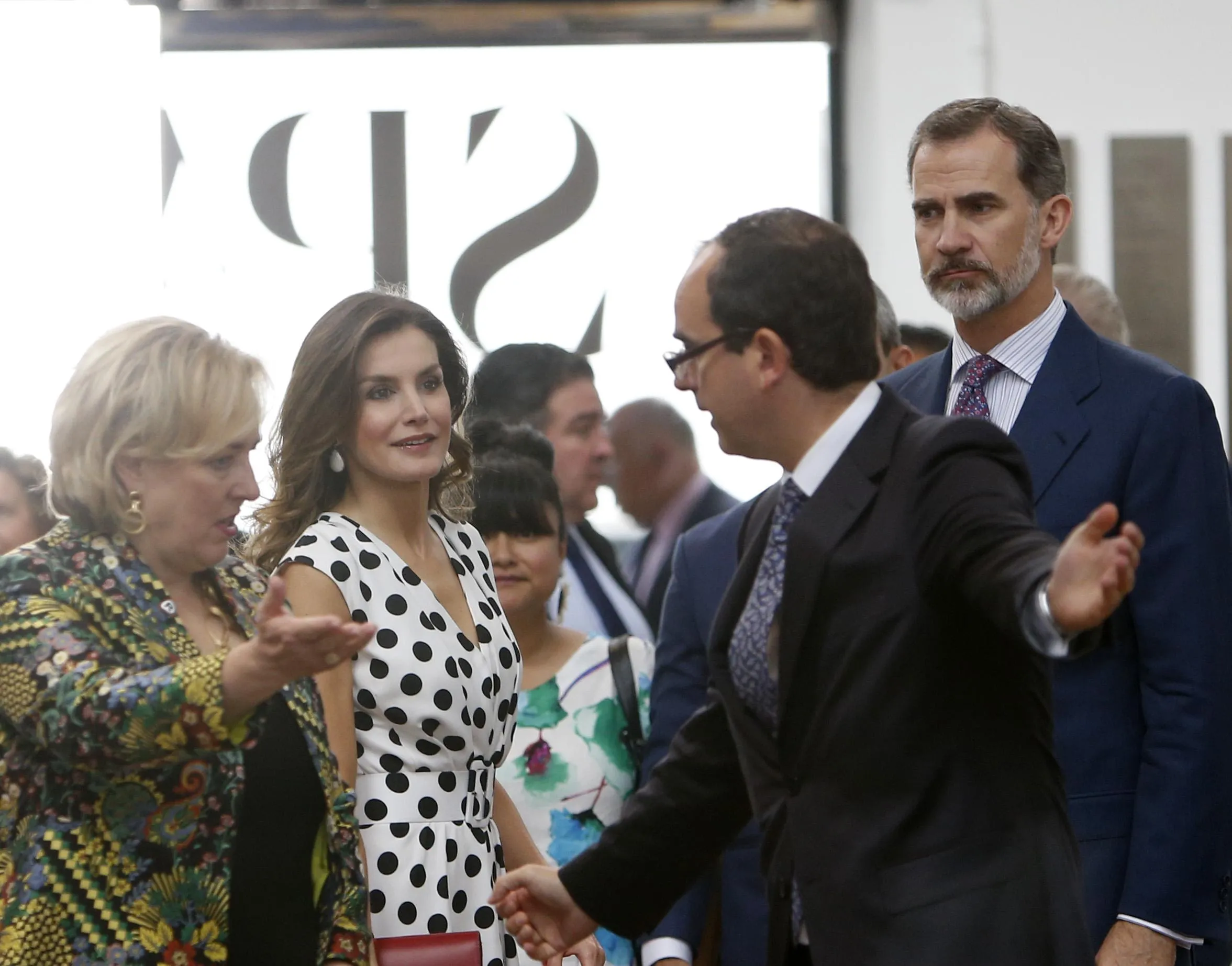 Для походу в музей королева Летиція вбрала стильну сукню з поясом. Плаття з V-подібним вирізом підкреслило струнку талію дружини короля Філіпа VІ. Літній "лук" іспанка доповнила білими сережками та чорними туфлями на підборах. Ідеальна укладка та легкий макіяж завершили образ королеви Летиції.