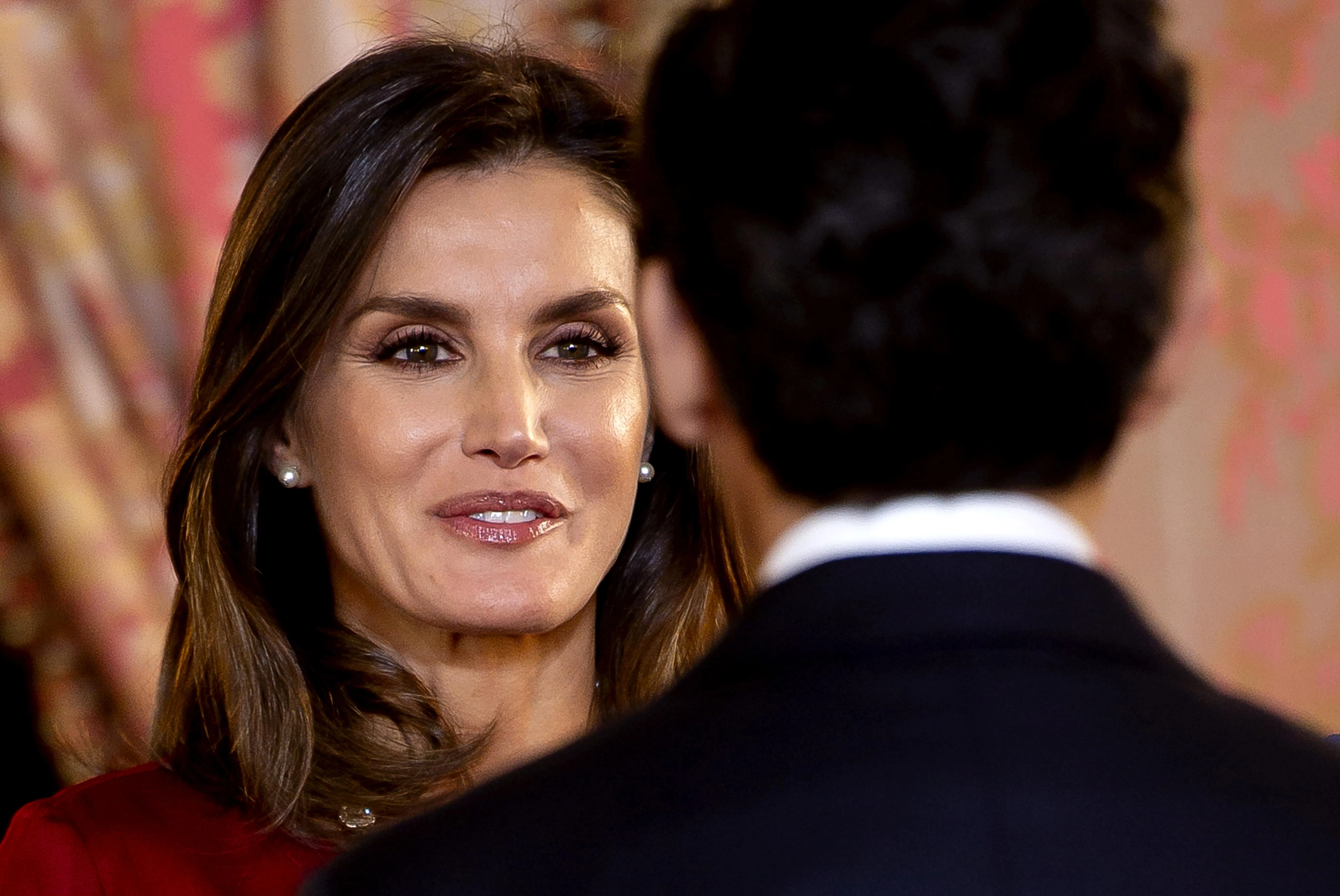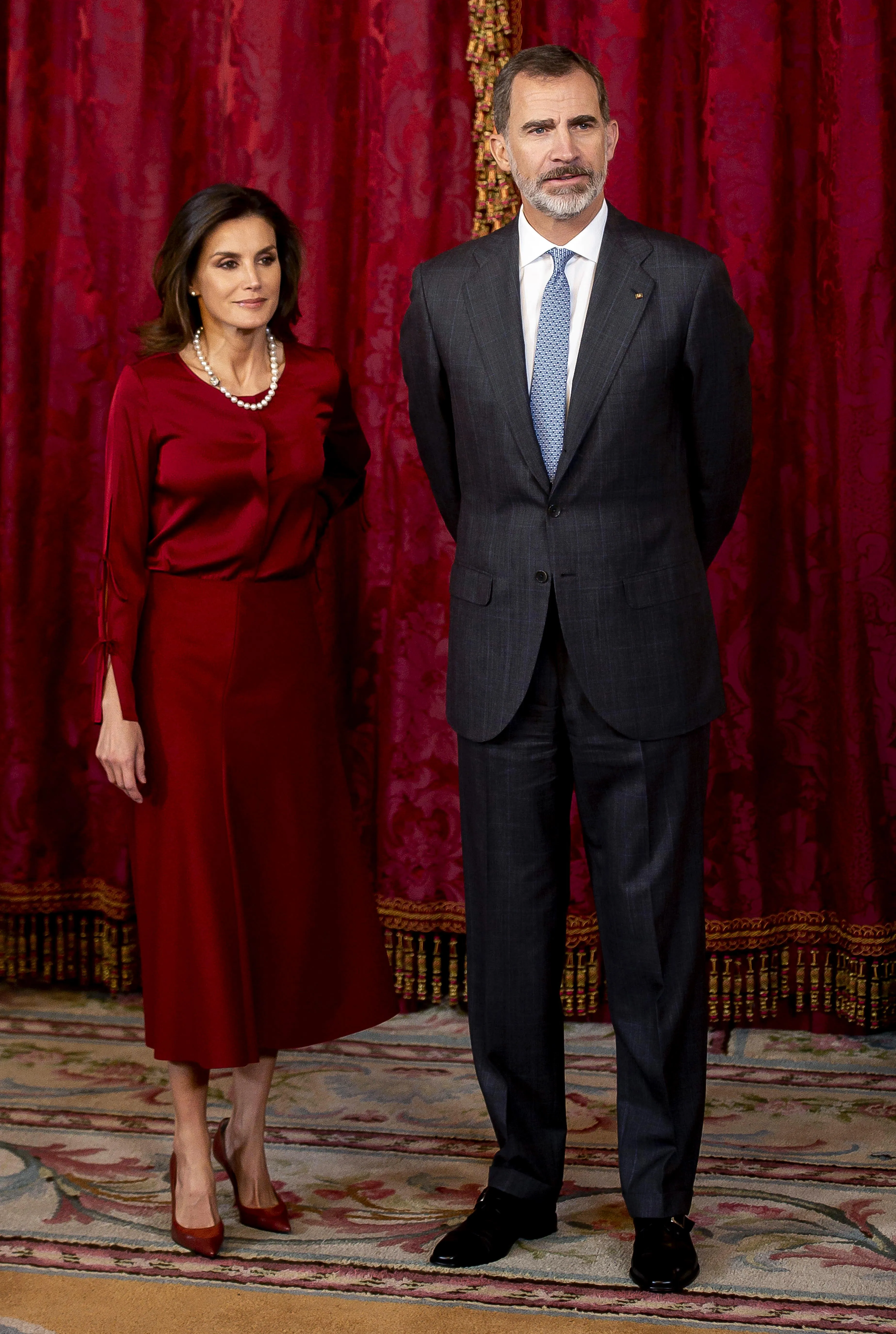 46-річна дружина короля Іспанія одягнула спідницю і блузку насиченого червоного кольору. Свій look Летиція доповнила туфлями на високих підборах у тон і перловим намистом.