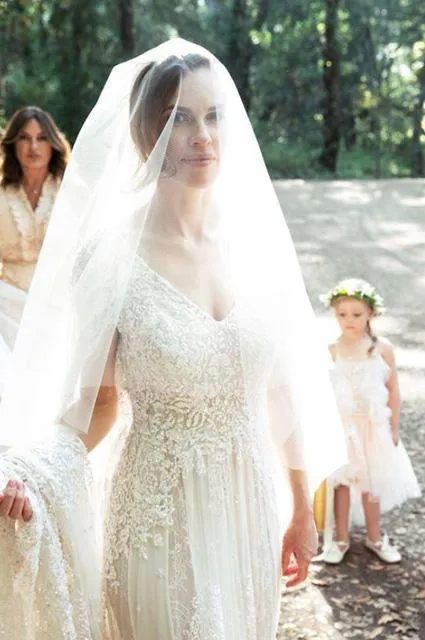 Зіркова наречена обрала розкішну сукню від бренду Elie Saab. Приголомшливе весільне вбрання для Хіларі Суонк шили 150 годин, а над створенням сукні працювали 7 професійних шевців. Окрім цього, ліванський дизайнер витратив 25 метрів французького мережива, 8 метрів шовкового шифону та 6 метрів органзи. У такій надзвичайній сукні Хіларі Суонк виглядала неймовірно.