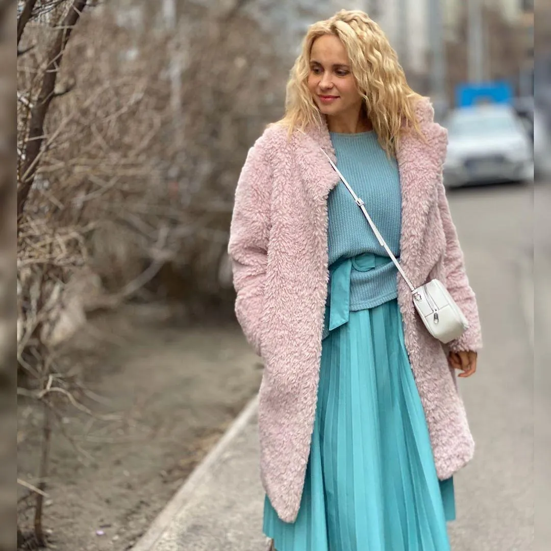 На знімку Лілія позує в неймовірно ніжному та весняному образі. Вона одягнена в актуальну екошубу пудрового кольору та блакитну кофту з плісированою спідницею. Гармонійним доповненням вбрання стала маленька біла сумочка через плече.