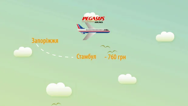Pegasus літає із Запоріжжя до Стамбула (Туреччина) за 760 гривень, з Києва до Анкари (Туреччина) – за 1080 гривень. А з турецьких аеропортів цим лоукостом можна летіти до Шарм-еш-Шейха (Єгипет) від 1263 гривень або до Тель-Авіва (Ізраїль) від 460 грн.