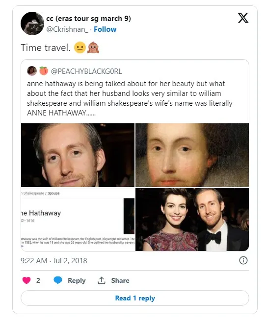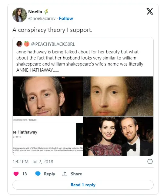 У мережі регулярно порівнюють фото Адама Шульмана з портретами Вільяма Шекспіра. Вважають, що насправді американський актор та ювелір – реінкарнація геніального британського драматурга. Родзинкою історії є те, що і Шульман, і Шекспір одружилися з жінками на ім'я Енн Гетевей. Щоправда між цими весіллями минуло близько чотирьох сотень років.