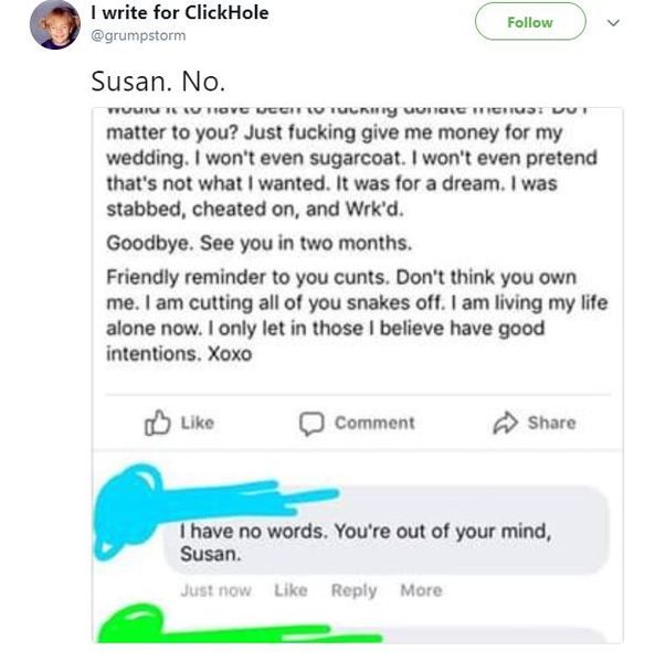 С'юзан вирішила висловити своє незадоволення у фейсбуці. У гнівному повідомленні вона звинуватила своїх друзів і родичів в тому, що вони зруйнували її весілля та стосунки з чоловіком. Вона заявила, що просила всього лише невелику допомогу від них, і була розчарована їхньою відмовою.
