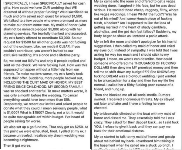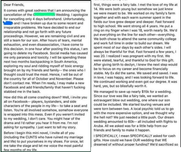 Наречена скасувала весілля через жадібних друзів / Скриншот з допису