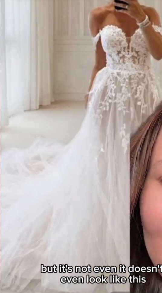 Коли наречена побачила результат, то просто оніміла. Пошита сукня ані близько не була схожа на ту, яку вона хотіла. Замість ніжно спадаючого А-силуету, дівчина отримала приталену сукню до кісточок. Мало того, що тканина та фасон були зовсім іншими, пошите вбрання навіть не підійшло дівчині по розміру.