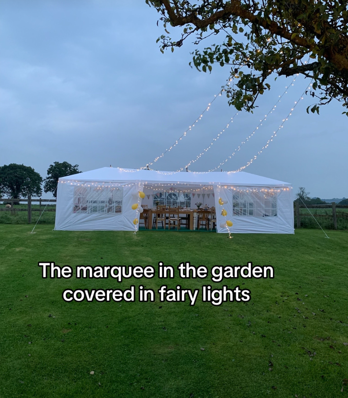Молодожены решили сэкономить на трансфере для себя и гостей, поэтому из церкви все вместе пошли пешком к палатке, где происходило празднование. В середине белого шатра поставили деревянные столы и кресла, а снаружи его украсили гирляндами, которые вечером добавили уюту к атмосфере.