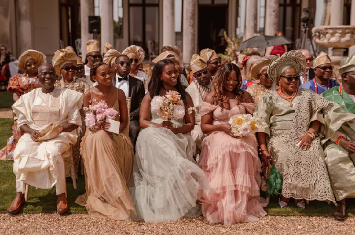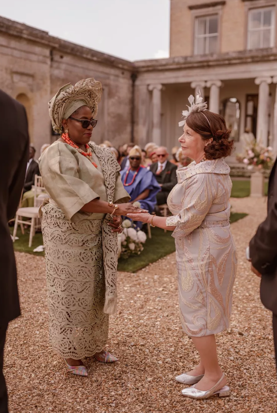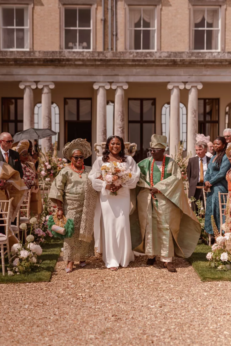 Погода в особливий день була сонячною і теплою, то ж церемонію молодята організували в саду. Під руку наречену до Евана вели і батько, і мати. Вони обидвоє одягнули традиційний одяг йоруба. Батьки Евана були одягнені у класичний одяг, чим нагадували героїв "Бріджертонів". Таке поєднання стилів зробило весілля Евана та Тіто дійсно особливим та автентичним.