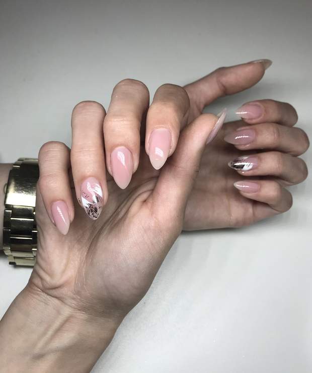 Цікаво виглядатиме ніготь з прозорою базою, який прикрашений крапками, чи смужками, фольгою. Такий мінімалізм, але він дуже цікаво виглядає в манікюрі,