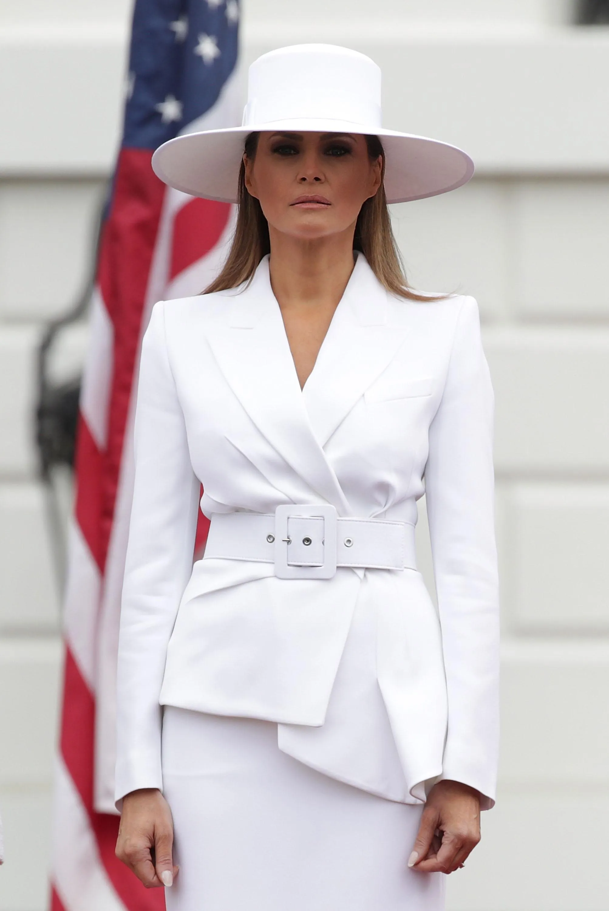 Для заходу Меланія одягнула білосніжний костюм Michael Kors, капелюх з широкими полями Hervé Pierre і витончені туфлі-човники Christian Louboutin з високими підборами.