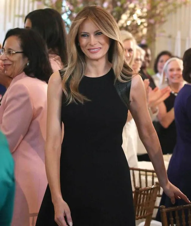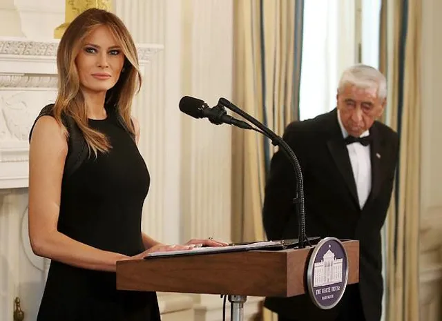 Для ланчу Меланія обрала сукню того ж дизайнера, який підготував її вбрання для інавгурації її чоловіка Дональда Трампа, Ralph Lauren. Для заходу Меланія одягла чорну сукню нижче колін і без рукавів.