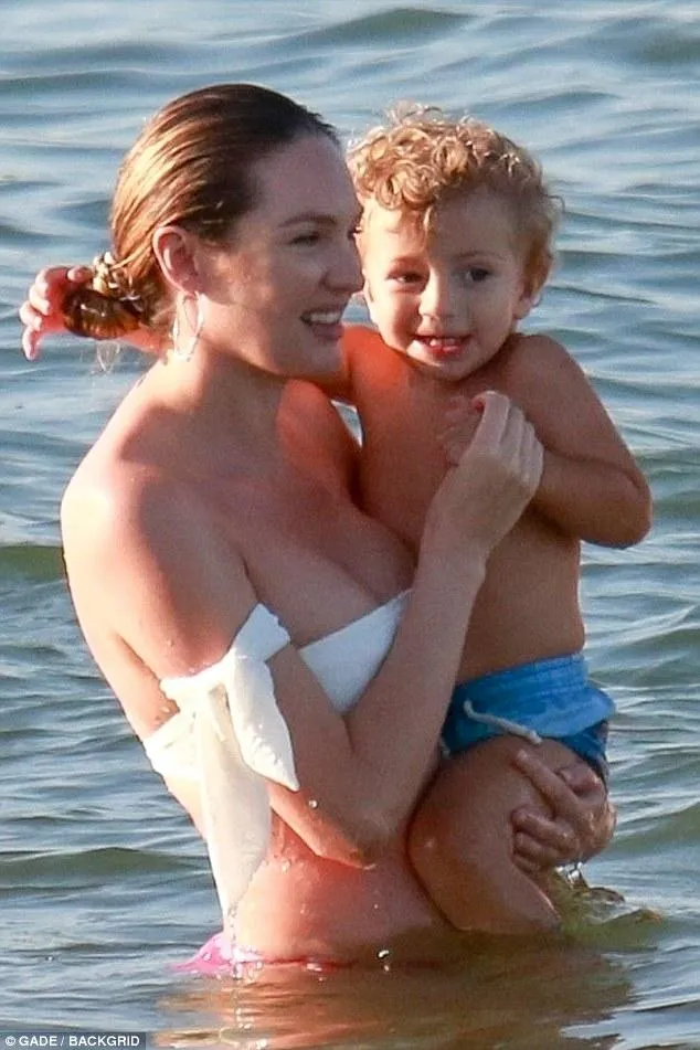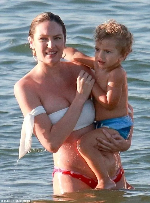 Модель виглядала чудово в оригінальному купальнику, який складався з червоних у горошок бікіні та бежевого топу. Проте Кендіс ще не повернулася у форму, в якій була до вагітності.