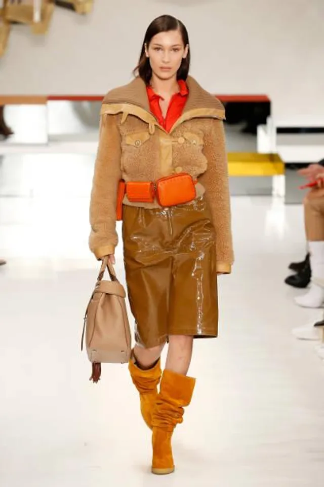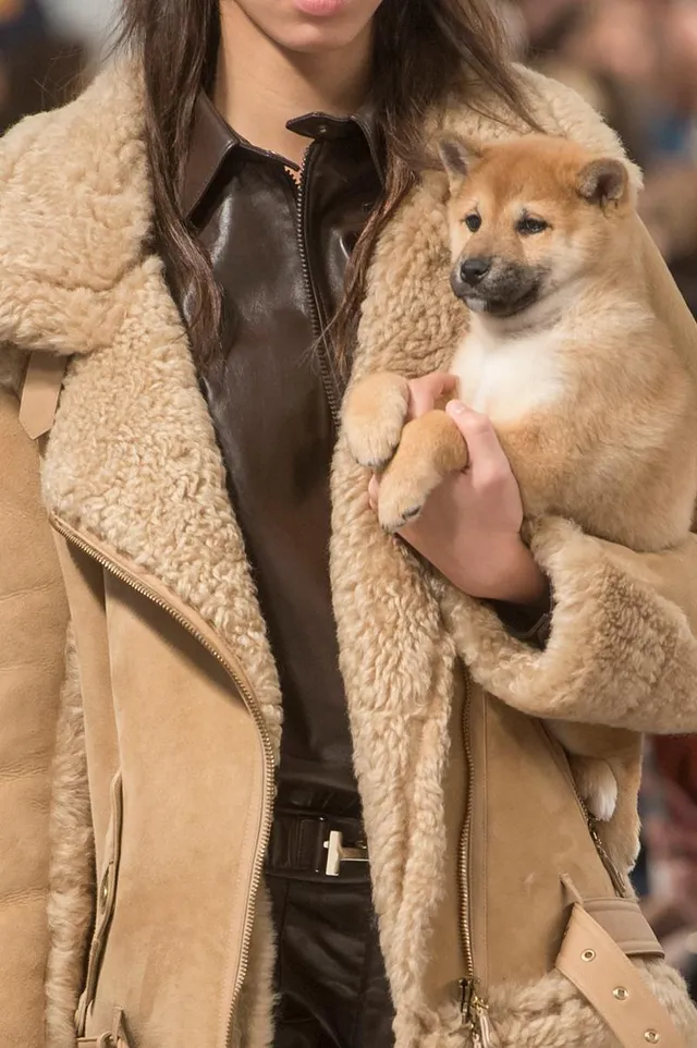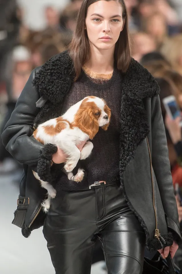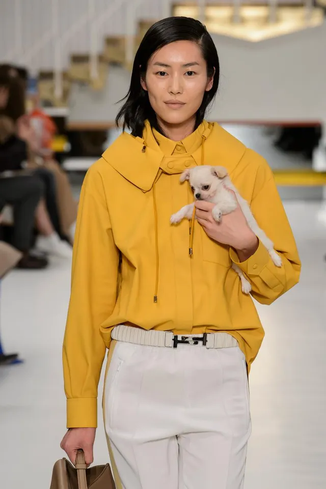 Показ елегантних "луків" Tod's відкрила Джіджі Хадід, тримаючи в одній руці сумку, а в іншій – білого французького бульдога з чорними цятками. Інша модель – Вітторія Черетті, вийшла в супроводі кокер-спанієля.