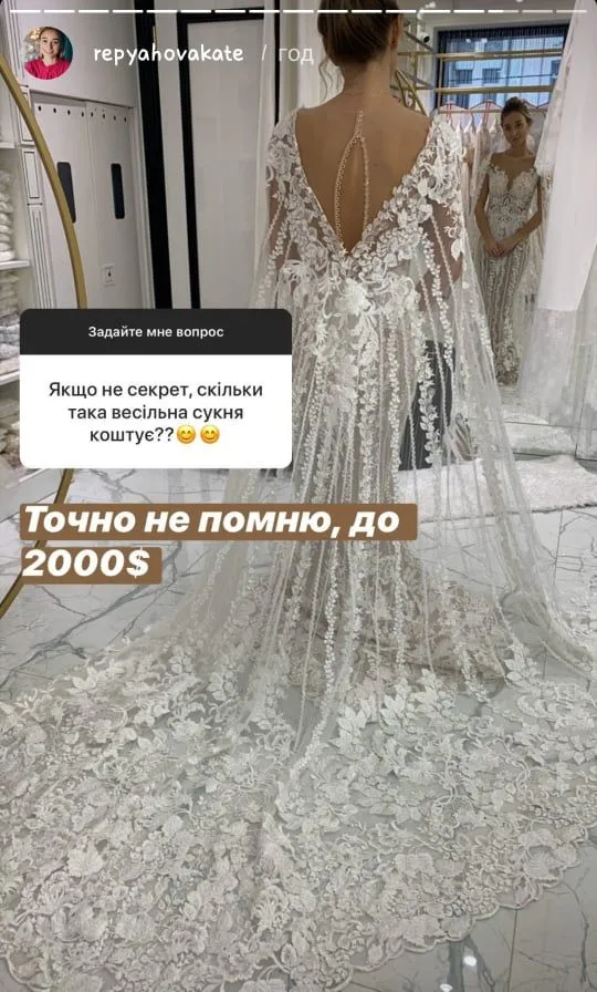 На знак вдячності щедрим прихильникам дівчина вирішила показати, які сукні встигла приміряти. Так, вона зізналася, що їй сподобалося одразу п'ять образів. Відповідаючи на питання в інстаграм-сторіс, Катерина анонсувала, що матиме одразу два вбрання нареченої. Крім того, фоловери поцікавилися, скільки коштують сукні, які приглядає для церемонії дівчина. Як запевнила кохана співака, вартість однієї з них становить близько двох тисяч доларів – майже 50 тисяч гривень.